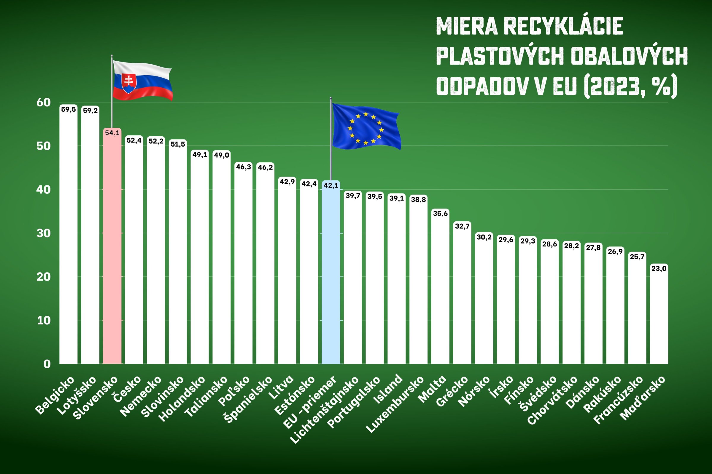 Slovensko sa v roku 2023 zaradilo medzi najúspešnejšie krajiny Európskej únie v oblasti recyklácie plastových obalových odpadov. S mierou recyklácie na úrovni 54,1 % výrazne prevyšujeme priemer EÚ (42,1 %) a patríme do európskej špičky. Ide o oficiálne údaje Štatistického úradu EÚ – Eurostatu, ktorý vychádza z dát reportovaných jednotlivými členskými štátmi. Podklady za Slovenskú republiku predkladá rezort životného prostredia v rámci pravidelného európskeho výkazníctva.